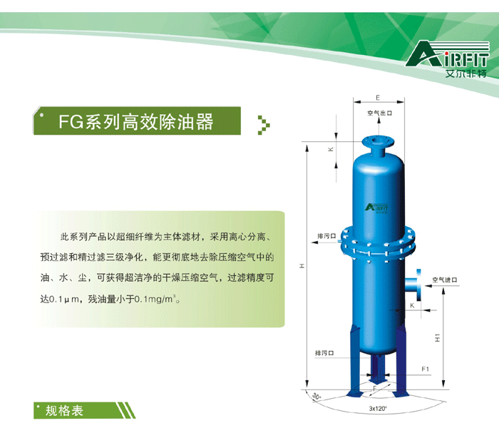 此系列产品以超级纤维为主体滤材,采用离心分离、预过滤和精过滤三级净化,能更彻底去除压缩空气中的油、水、尘,可获得超洁净的干燥压缩空气,过滤精度可达0.1um,残油量小于0.1mg/立方米
